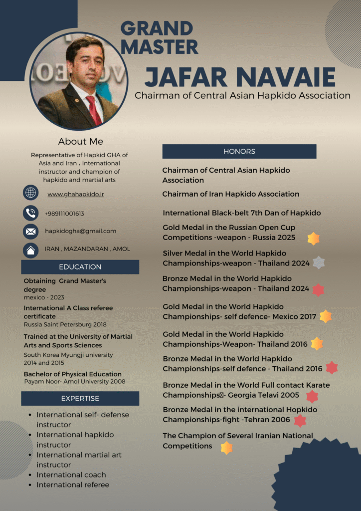 After many years of international activity, including various international seminars and competitions, as well as sending the Iranian team to various world competitions, Jafar Navaei reached a new stage of technical and managerial growth and was recognized as one of the international Hapkido instructors. He has taught at international Hapkido and self-defense seminars in Germany, Nepal, India, Mexico, Azerbaijan, and Russia. In 2023, he was appointed as the Hapkido official in Central Asia by the GHA World Hapkido Organization and with the approval of the continental Hapkido officials. He established the Central Asian Hapkido Association for the first time.
